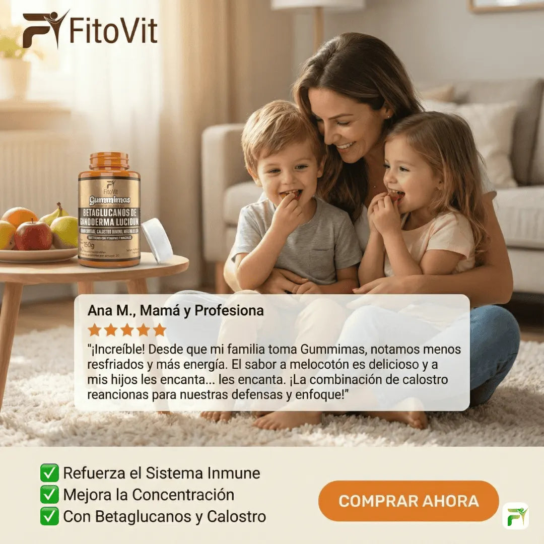 Gummimas Betaglucanos de Ganoderma Lucidum Fitovit es un alimento en forma de gomitas de gelatina, formulado con una combinación de hongos funcionales (Ganoderma lucidum, Shiitake y Melena de León), calostro bovino y un conjunto de vitaminas y minerales esenciales.